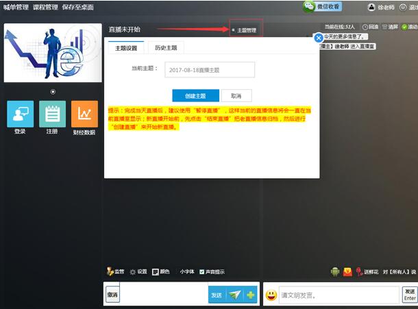 分析師帳號(hào)登錄后,可點(diǎn)擊“主題管理”開始設(shè)置直播主題,見上圖紅框及箭頭所示,當(dāng)“創(chuàng)建主題”后直播室會(huì)自動(dòng)變成開始直播狀態(tài),分析師可以在底部輸入框輸入圖片和文字展開直播了,更多的功能彩蛋只有實(shí)際操作了才能被發(fā)現(xiàn)。