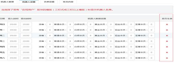 在上圖點(diǎn)擊“機(jī)器人設(shè)置”后進(jìn)入,設(shè)置界面,只需要打打鉤就完成了每天的機(jī)器人設(shè)置,還可以為機(jī)器人設(shè)置名字和登錄或者退出時(shí)間等,然后在“是否生效”欄打鉤即可即可完成設(shè)置,如下圖3-3所示。