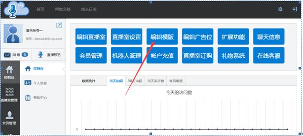 首先我們用帳號(hào)登錄金融說云直播平臺(tái),也就是直播室的管理總后臺(tái)找到“編輯模板”導(dǎo)航,見下圖(1-1)