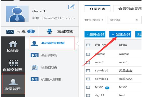 首先需要設(shè)置直播室的“講師”帳號(hào),用來在直播室里面進(jìn)行圖文直播和前臺(tái)直播室的管理,該帳號(hào)在“會(huì)員管理”處創(chuàng)建,會(huì)員管理入口見下圖2-1所示: