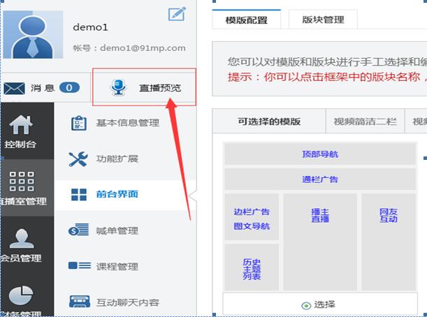 在上圖“創(chuàng)建會(huì)員”處創(chuàng)建等級(jí)為“播主”的帳號(hào)即可,該帳號(hào)通過圖(1-4)的右上角進(jìn)行登錄直播。此系統(tǒng)功能比較強(qiáng)大,功能可自定義的地方很多,但對(duì)大部分新手講師們來說不用刻意去修改些什么,系統(tǒng)已經(jīng)都默認(rèn)配置好了的,這樣大大減少了直播室總后臺(tái)的管理時(shí)間成本。