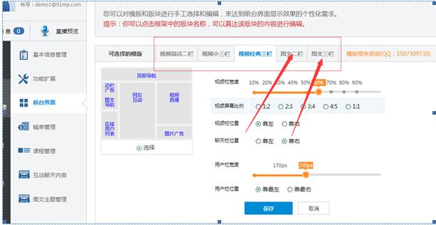 上圖中紅框區(qū)域是可選的模版框架,用來確定直播室是視頻直播室還是圖文直播室,我們演示的是圖文直播室,所以請(qǐng)選擇“圖文二欄”或者“圖文三欄 ”式的版式,其他默認(rèn),點(diǎn)擊“保存”即可,這樣就創(chuàng)建了一個(gè)自己的圖文直播間了。如下圖1-3