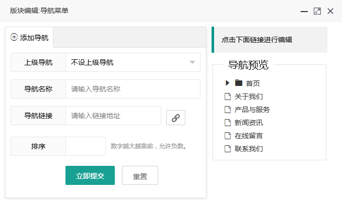 我們系統已經給出了默認導航,見右邊導航預覽,如果用戶不想添加新的導航,可以直接對原有默認導航進行編輯,如何編輯呢?鼠標移到右邊導航預覽欄目里要編輯的導航,然后單擊,就成如下頁面,編輯完成,立即提交即可。