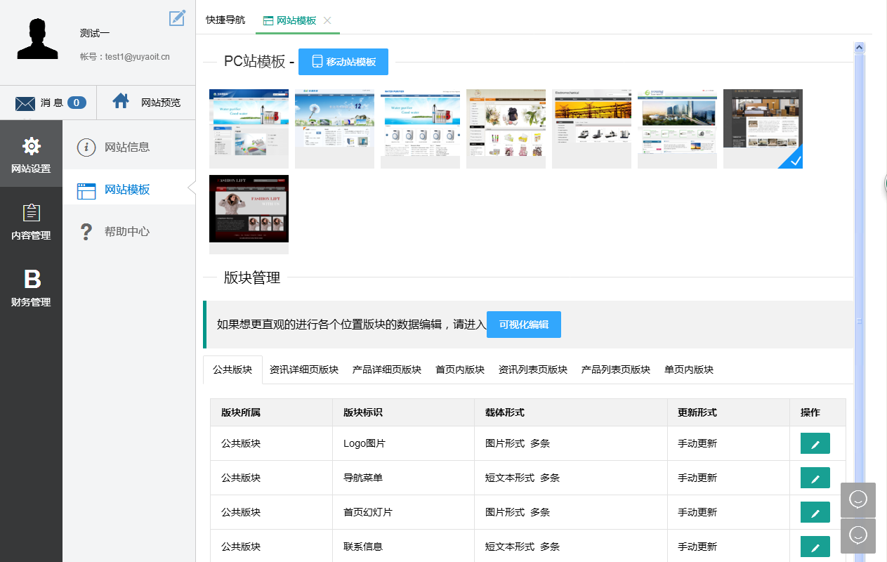 云建站系統一共有以下幾大版塊:公共版塊、首頁內版塊、資訊列表頁版塊、資訊詳細頁版塊、產品列表頁版塊、產品詳細頁版塊、單頁內版塊。根據不同的版塊標識,里面的編輯項目會有所不同,下面我們列舉幾個版塊進行舉例說明