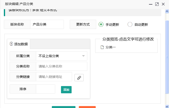 許多版塊中會有分類數據,比如資訊分類,產品分類,單頁分類等,像類似這種版塊的編輯,就會有自動更新和手動更新的區別。請看如下頁面:
