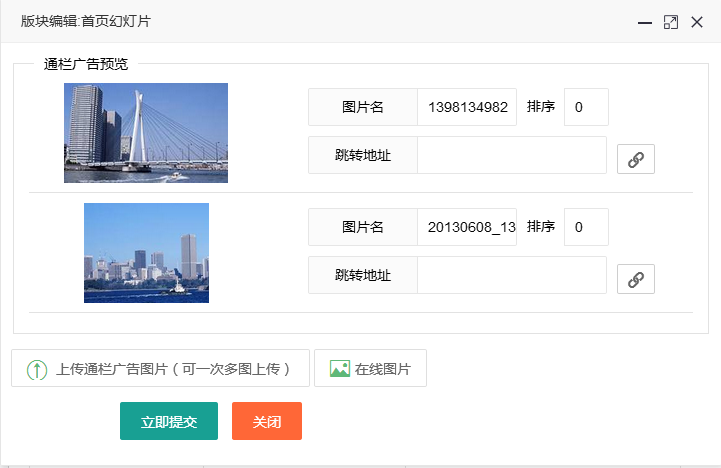 幻燈片也有排序和鏈接,輸入方式跟上面導航單一樣,用戶要上傳本地圖片點擊“上傳通欄廣告圖片”,可以多圖上傳。云建站系統有一個圖片管理系統,它會把用戶上傳過的歷史圖片作記錄,如果用戶想在上傳的歷史圖片上選擇,則點擊“在線圖片”按鈕。
