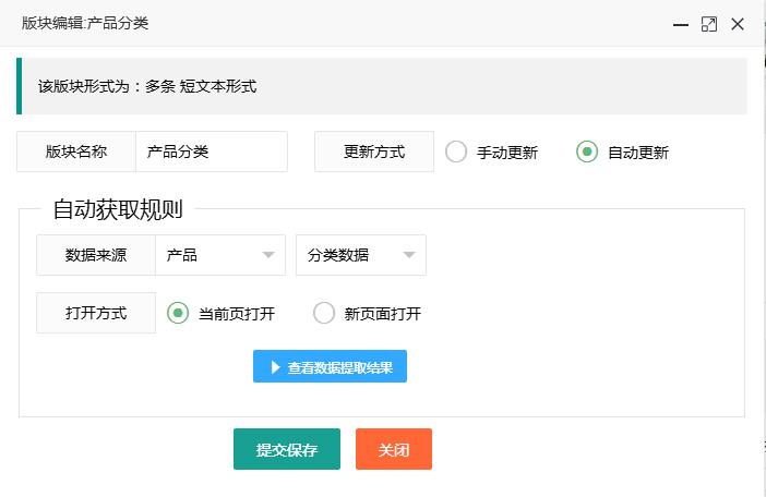 當選擇自動更新,則根據自動獲取規則,系統會自動獲取產品或者資訊的數據呈現在頁面,如果產品或者資訊的分類或者內容改變也會隨之改變。